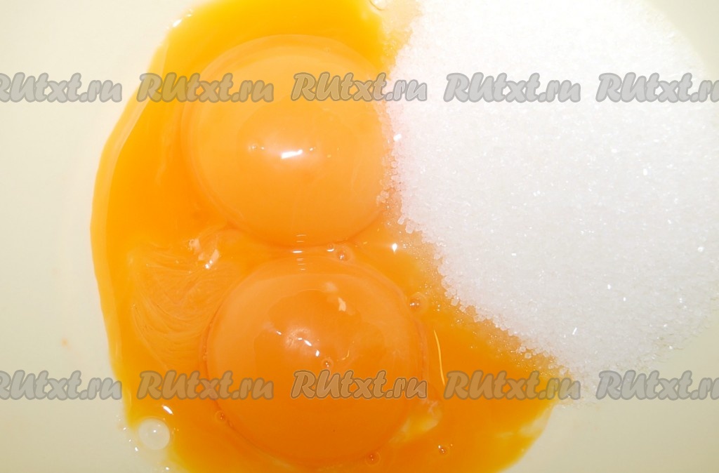 Желтки отделить от белков. В миску поместить желтки с сахаром и взбивать 20 минут. Время взбивания желательно не сокращать, чтобы тесто получилось более пышным, нежным и не отдавало "яичным запахом".