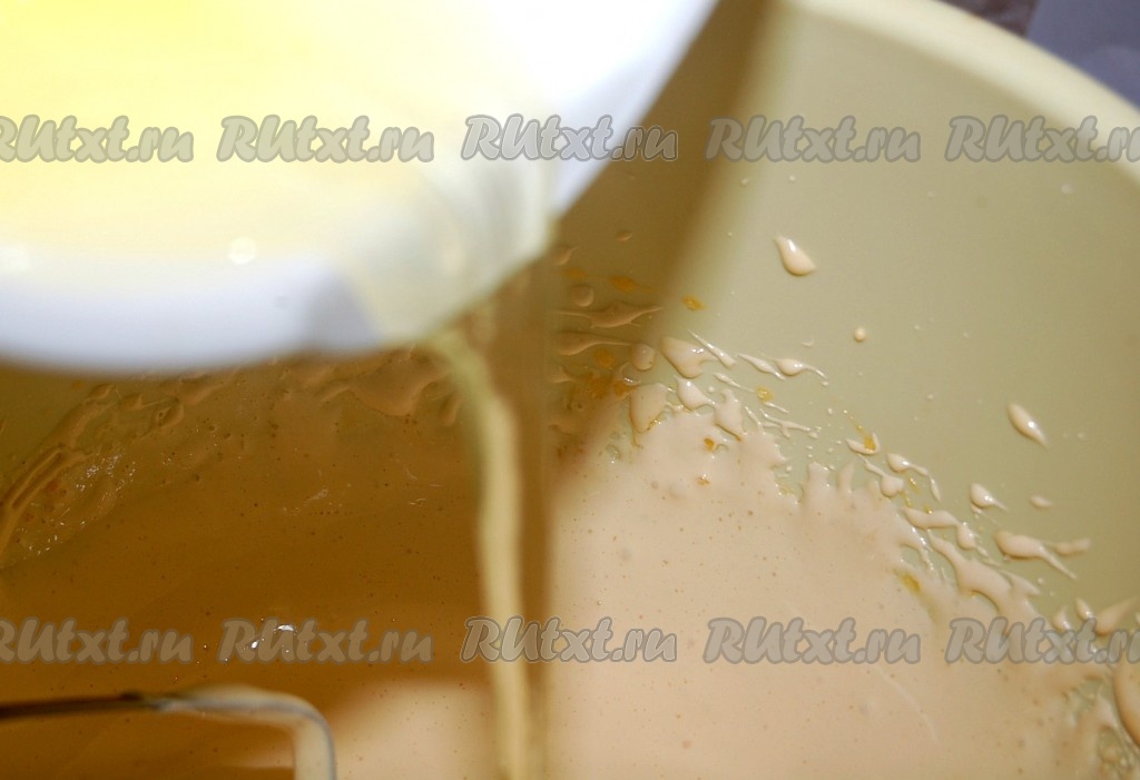 Масло сливочное растопить, охладить и тонкой струйкой влить в миску, постоянно взбивая.