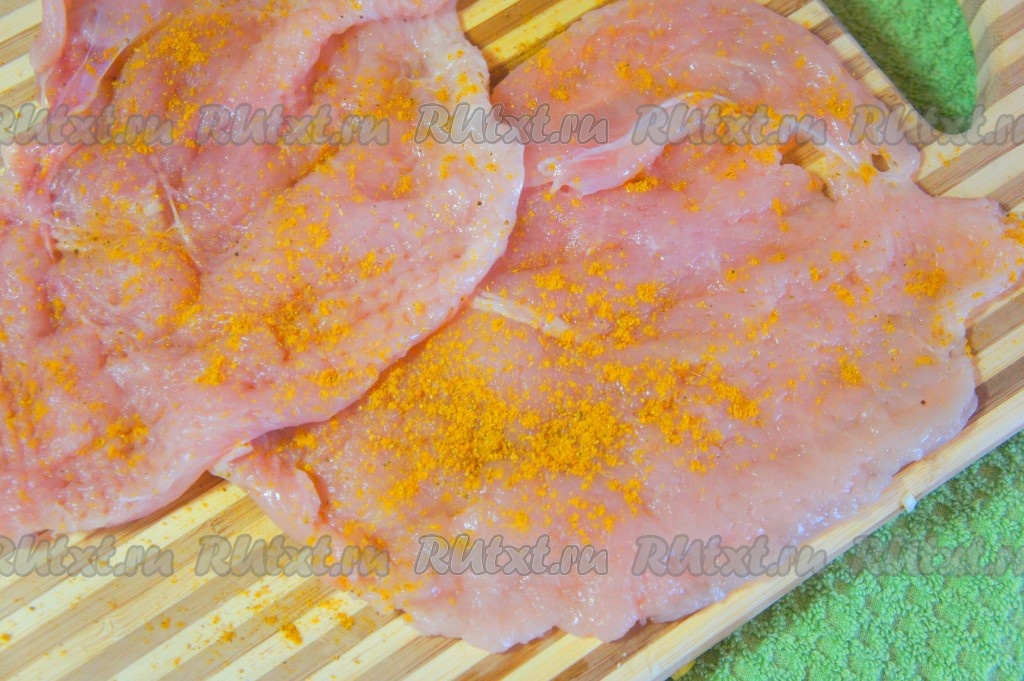 Куриное филе промыть, обсушить, отбить молоточком, формируя плоскую поверхность. Натереть мясо смесью пропущенного через пресс 1 зубчика чеснока, соли, смеси перцев и карри. Оставить пропитаться солью и специями на 10-15 минут.