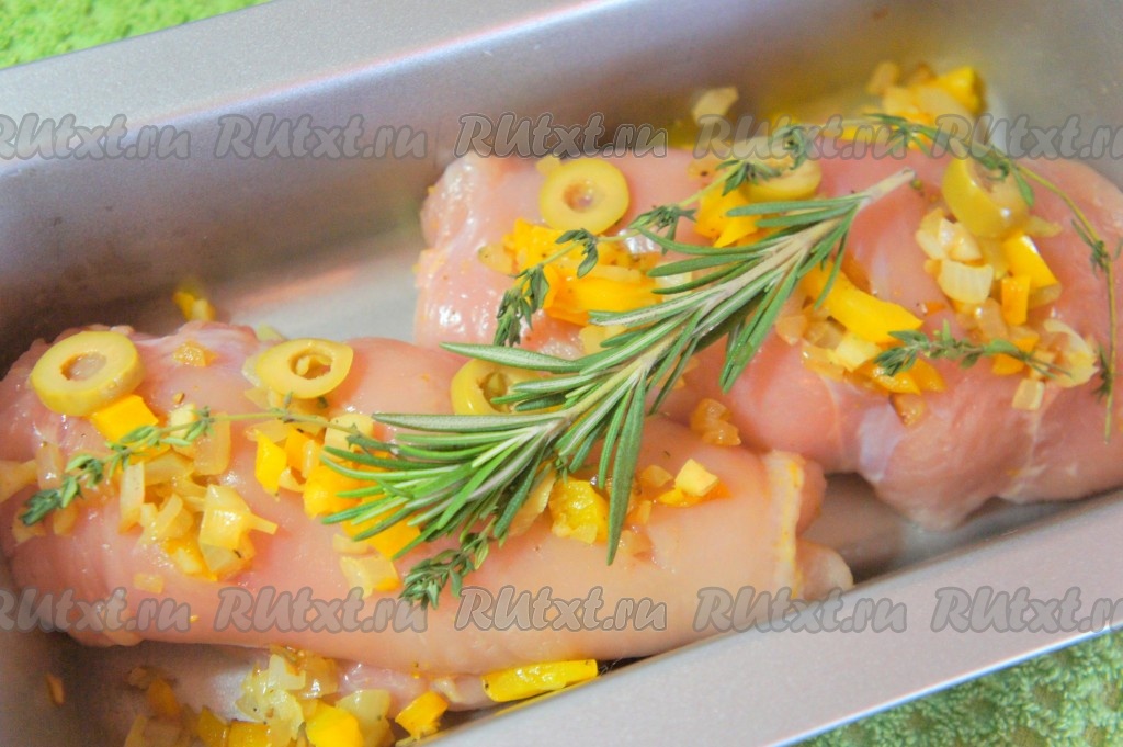 Духовку разогреть до 180 градусов. Форму смазать оливковым маслом, выложить рулеты из курицы в форму. Если останется овощная начинка, то выложите её сверху рулетов. Сверху положите нарезанные оливки, веточки розмарина и тимьяна.