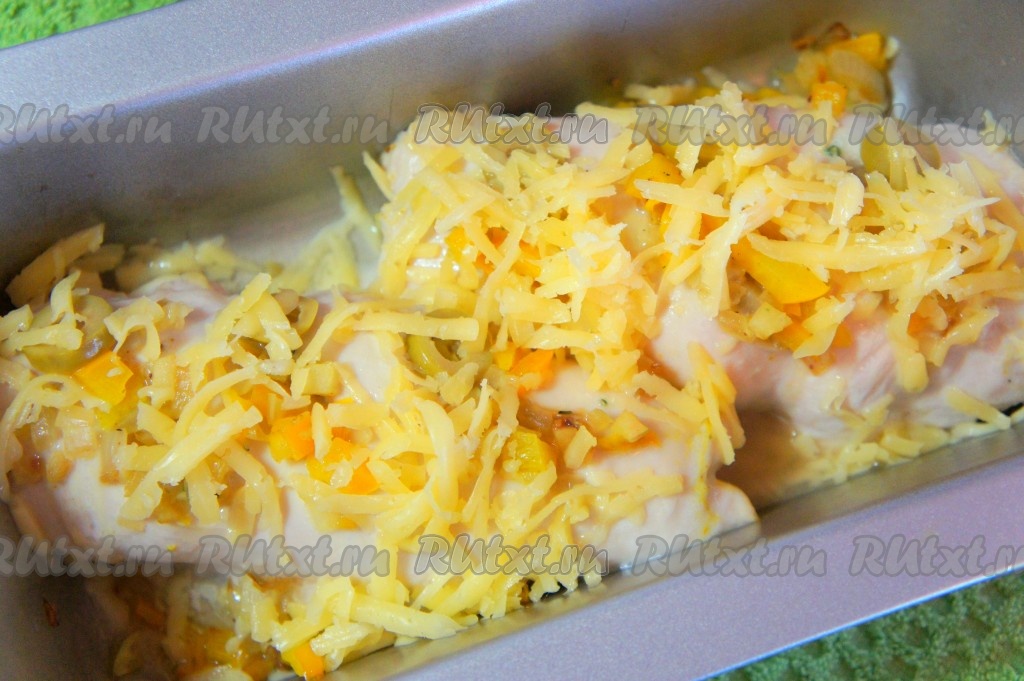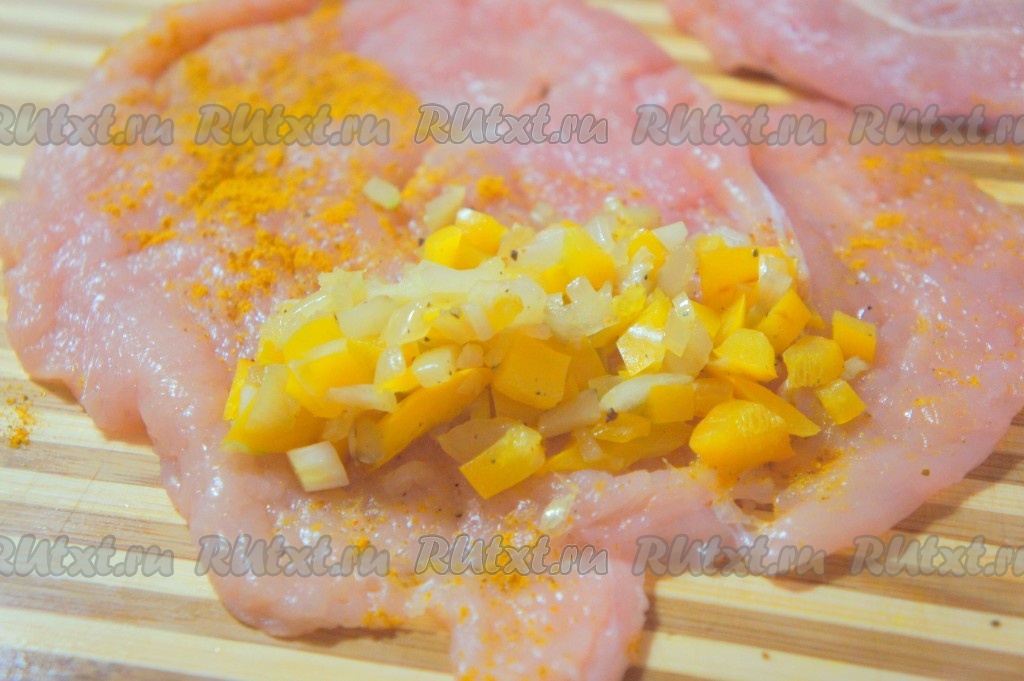 Половину остывшей овощной начинки выложить на один край отбитого куриного мяса.