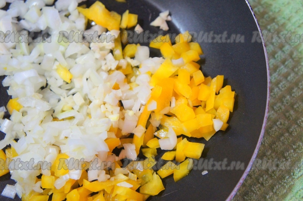 Тем временем приготовим начинку для куриных рулетиков. Болгарский перец промыть, убрать плодоножку, перегородки и семена. Нарезать перец на мелкие кубики, добавить очищенный и мелко нарезанный лук, 1 зубчик пропущенного через пресс чеснока, посолить, положить специи по вкусу и обжарить на среднем огне с добавлением небольшого количества оливкового масла до прозрачности лука (на это потребуется около 4-5 минут). В процессе обжаривания не забывайте помешивать овощи, чтобы они не подгорели. Снять начинку с огня и дать остыть.