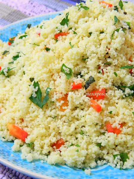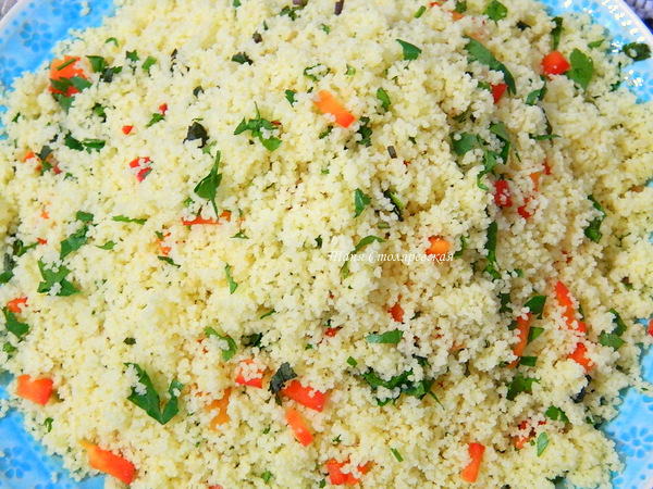 Готовый кус-кус перемешиваем с зеленью, болгарским перцем и чили. Хорошо еще сбрызнуть соком лимона.