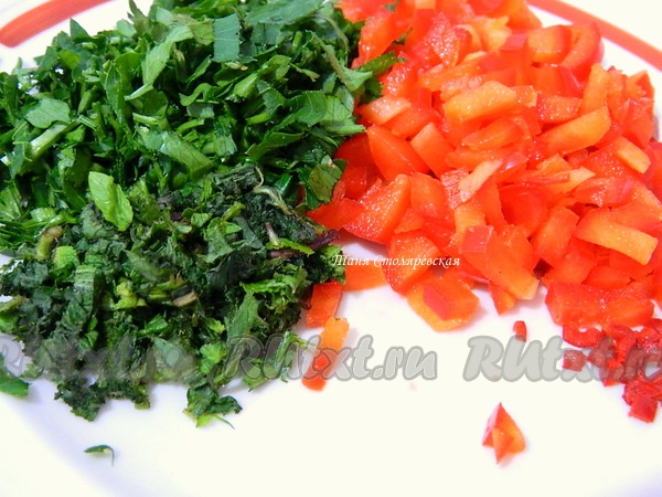 Измельчаем перец и зелень.