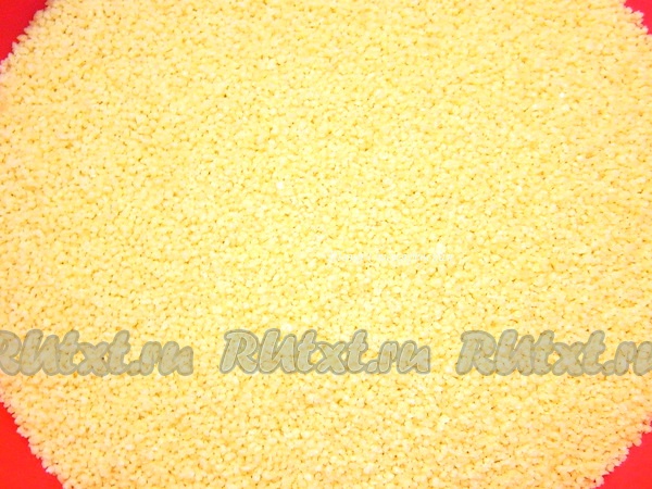 Высыпаем кус-кус в глубокую миску, добавляем масло, соль.
