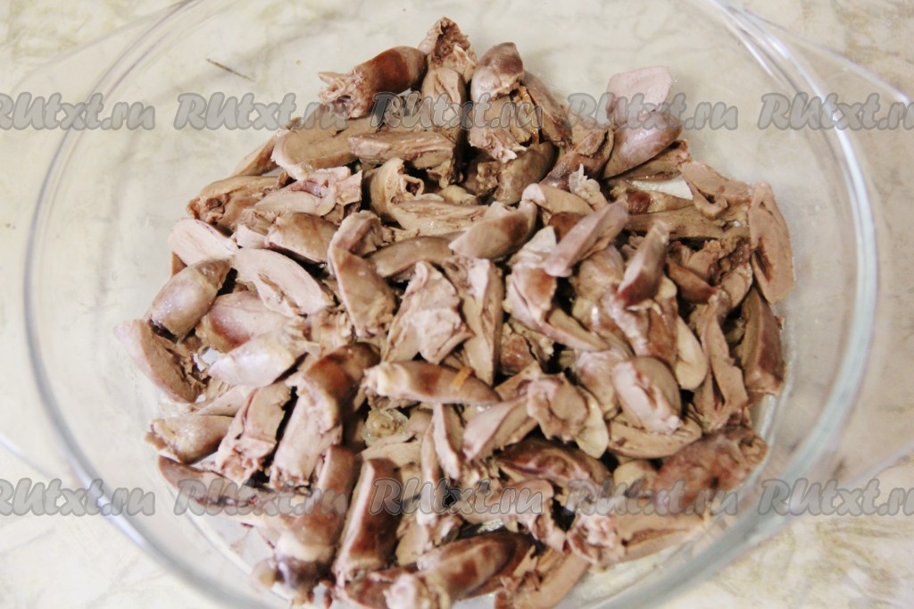 Куриные сердечки отварить и нарезать для салата соломкой.