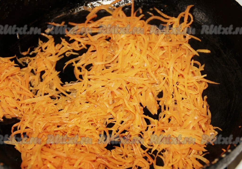 Морковь натереть на терке для корейской морковки. Пассировать на сковороде с добавлением растительного масла.