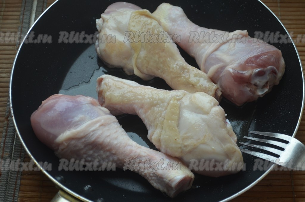 Куриные ножки предварительно помыть, просушить бумажным полотенцем, посолить. Обжарить голени на растительном масле с двух сторон до золотистого цвета на среднем огне (на обжаривание потребуется буквально 5-7 минут).