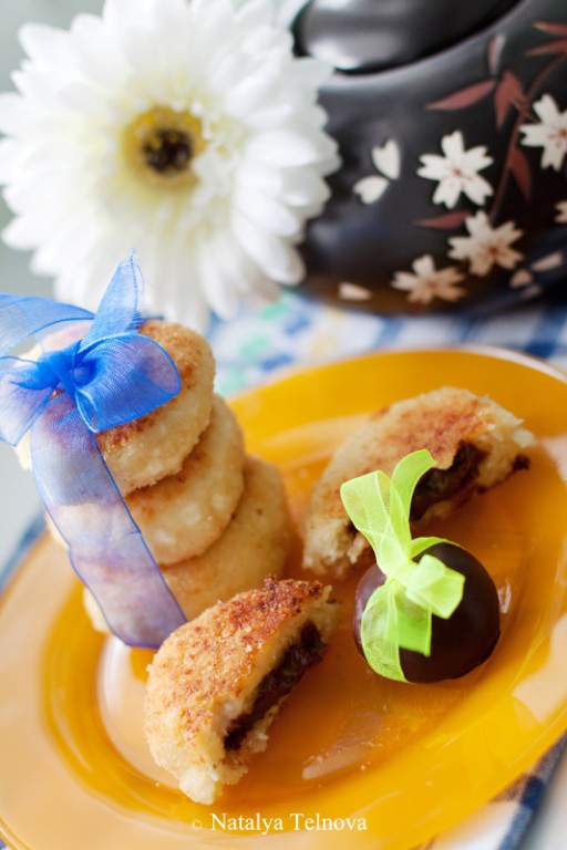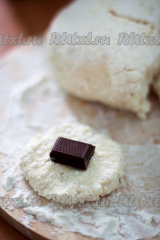 Тесто разделите на кусочки, сделав из них маленькие лепешки, и вложите в центр каждой по одной дольке шоколада. Края защипните, сформировав круглый сырник, и обваляйте в сухарях.