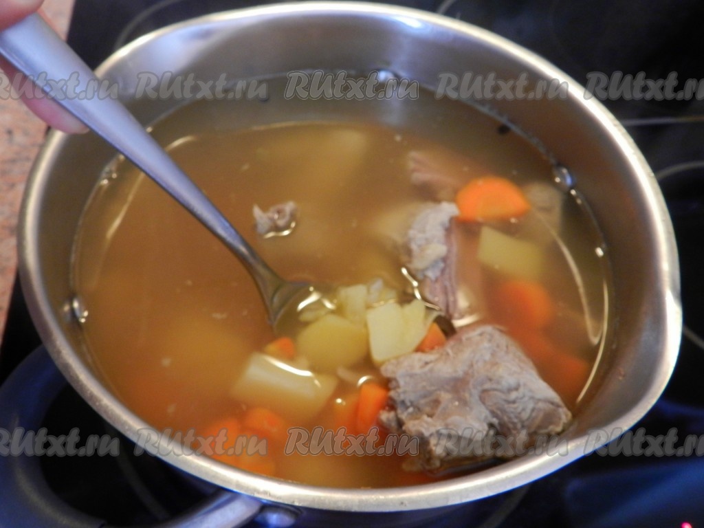 Свинину вымыть, залить 2-2,5 литрами воды и поставить на сильный огонь. Когда вода закипит, уменьшить огонь, снять пену, добавить в суп луковицу и варить до готовности мяса (примерно, 1 час). За 10 минут до окончания варки мясного бульона выложить в кастрюлю нарезанную морковь (я нарезала тонкими полукружочками), посолить.