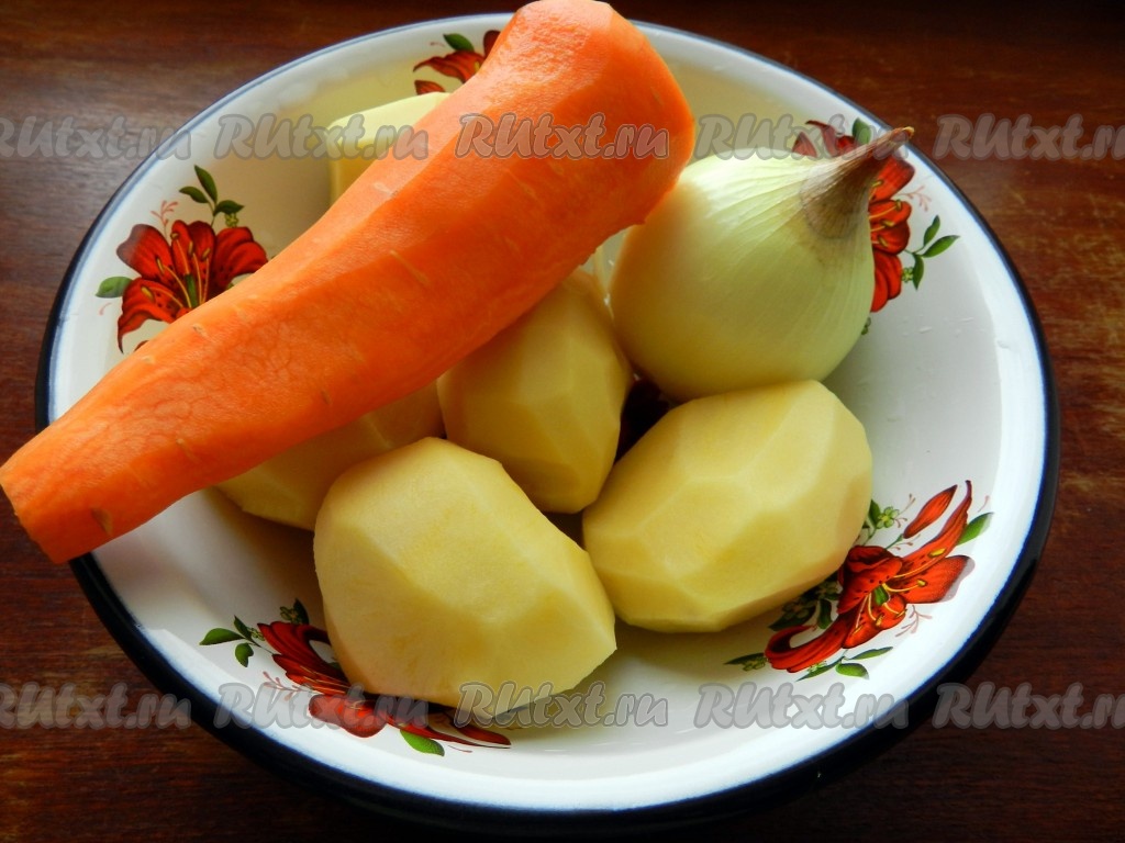 Морковь, картошку и лук очистить. Картофель поместить в воду, чтобы он не потемнел.