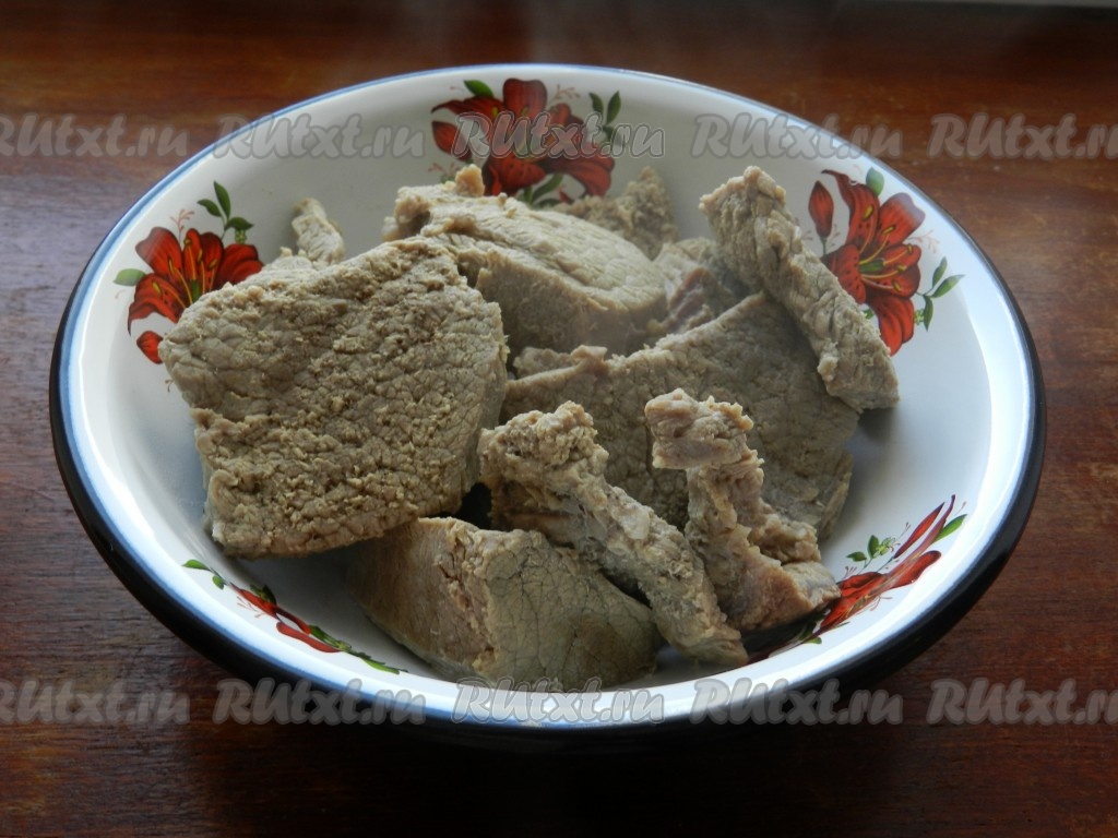 Затем снять кастрюлю с бульоном с огня. Из бульона вынуть свинину, если нужно, отделить мясо от костей и нарезать на порционные кусочки.