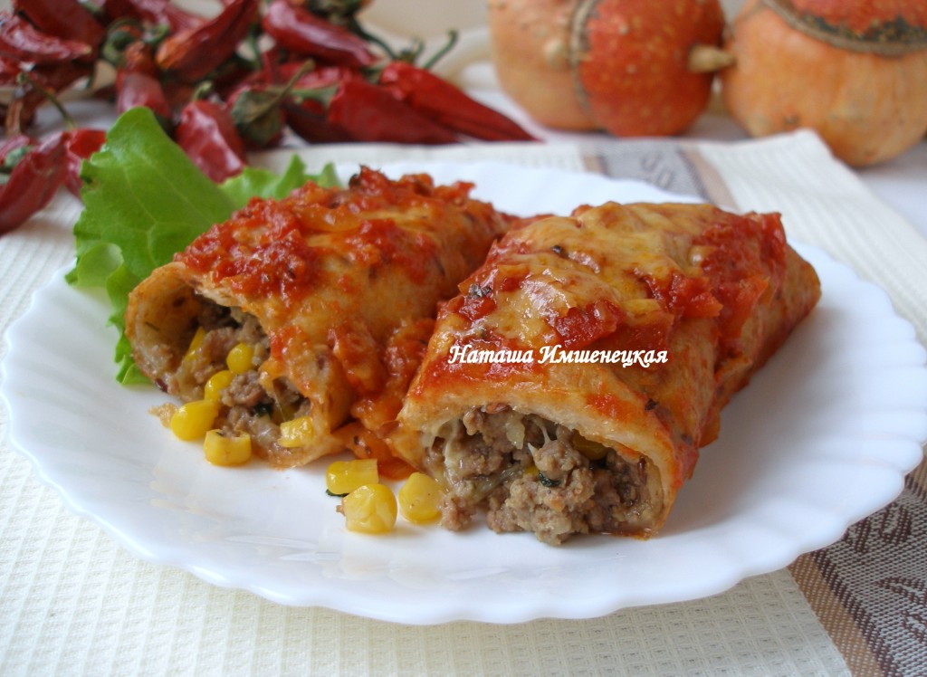 Энчилада - блюдо родом из мексиканской кухни. Представляет собой тонкие лепешки из пшеничной или кукурузной муки (тортилья) с начинкой из мясного или куриного фарша и запеченные в остром соусе под сыром. Важную роль в приготовлении энчилада играет соус. В него можно добавить овощи, сделать его более или менее острым с помощью соуса табаско.