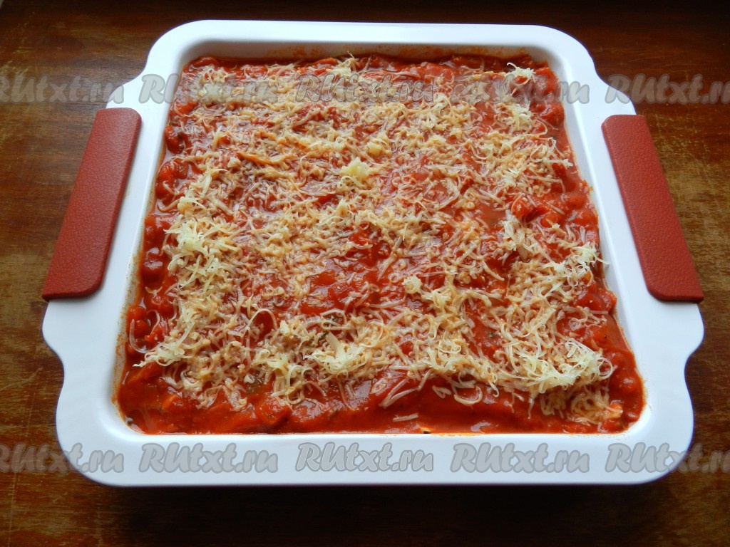 Посыпать тертым сыром и поставить в духовку, разогретую до 180 градусов, на 30 минут.
