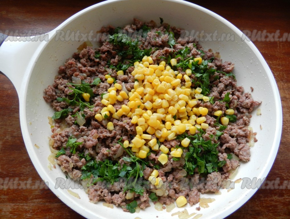 Одну луковицу очистить и мелко нарезать. На растительном масле обжарить лук, затем добавить фарш, 2 зубчика чеснока, пропущенные через пресс, и специи. Обжарить все вместе, разбивая комочки фарша. Добавить кукурузу и зелень, перемешать, немного обжарить до готовности фарша. Начинка готова.