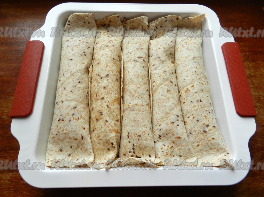 Так поступить со всеми лепешками. Уложить лепешки с фаршем в форму для запекания.