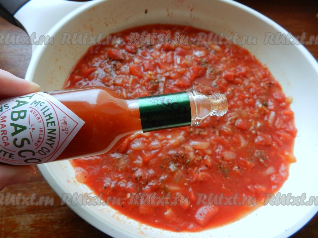 Очистить и обжарить вторую луковицу с оставшимся чесноком. Выложить к луку помидоры из банки, добавить соль, перец, специи и томатную пасту. Осторожно добавить острый соус табаско.