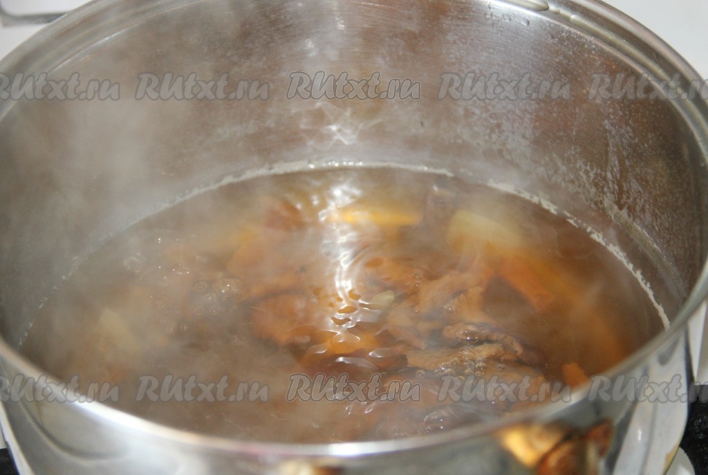 Грибы промыть и залить водой. Если у вас грибы сухие, как у меня, то их нужно предварительно замочить в воде, которую в дальнейшем использовать при варке супа. Отварить грибы до готовности в подсоленной воде. Я отвариваю их с луковицей, вы можете лук использовать в зажарке. Готовые грибы вынуть из кастрюли, грибной бульон процедить.