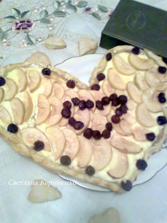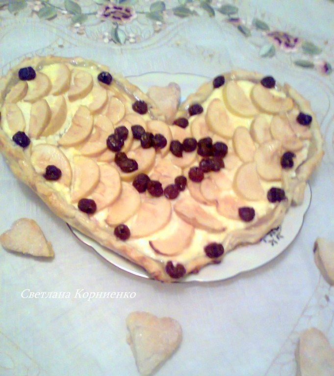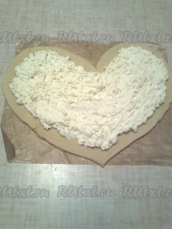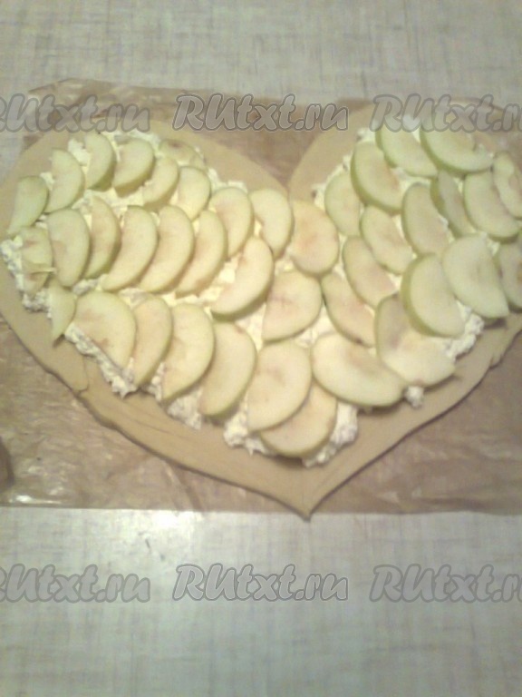 Яблоки нарезать ломтиками. Тесто раскатать в прямоугольник толщиной 0,5 см. Вырезать сердечко, из остатков теста вырезать маленькие сердечки. На выстланный пергаментом противень выложить тесто. На тесто поместить начинку из творога.