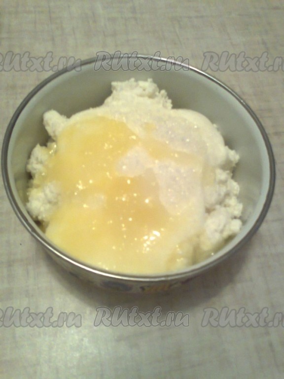 Творог смешать с сахаром и сметаной, белок добавить к творогу, перемешать.