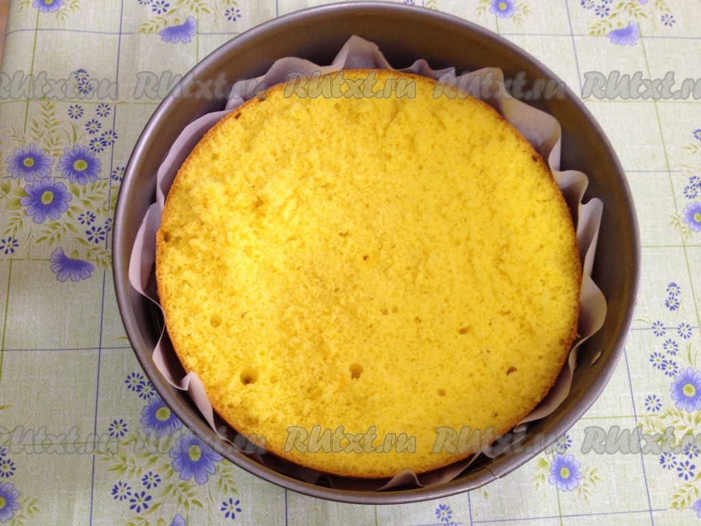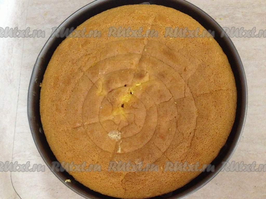 Бисквит разрезаем пополам и кладём в разъемную форму или просто на противень. Слегка пропитываем ромовым сиропом (1 столовая ложка рома + 1 чайная ложка сахара + 100 мл воды).