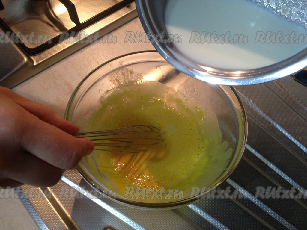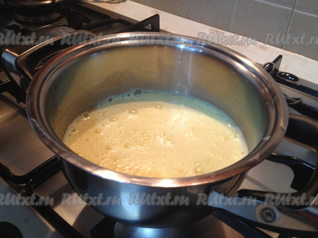 Вливаем кипящее молоко в эту смесь и ставим на огонь на 2-3 минуты, постоянно помешивая.