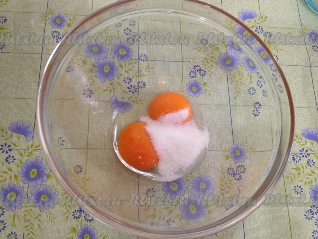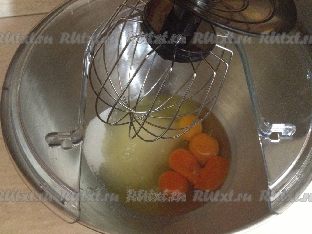 Делаем бисквитное тесто. Для этого взбиваем яйца с сахаром, пока масса не увеличится в 2-3 раза.