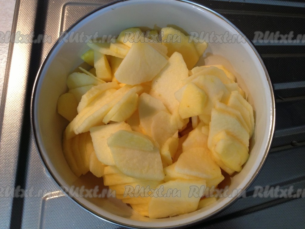 Готовим начинку торта. Яблоки очищаем и нарезаем тонкими дольками.