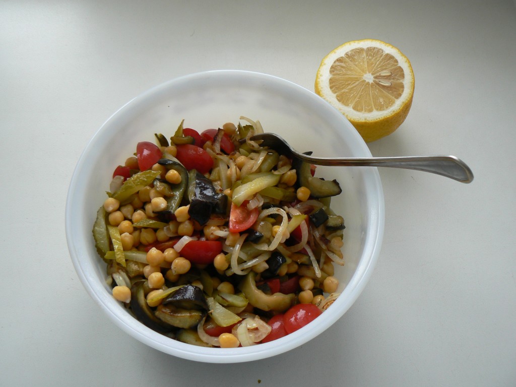 Очень сытный и вкусный салат, удачное сочетание преcного нута, кисловатого помидора и сочного баклажана, а маринованный огурцик придает небольшую пикантность салату, завершая образ.
