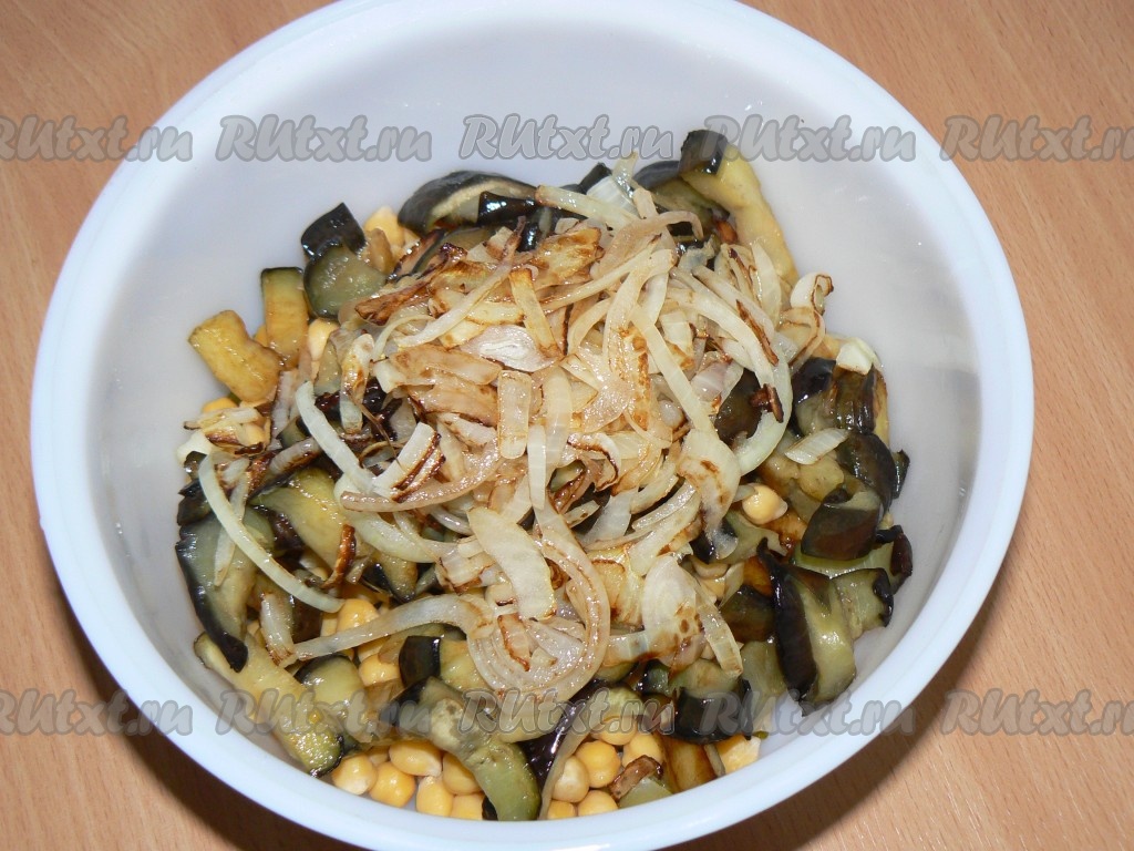 Лук нарезать полукольцами, обжарить на растительном масле до золотистого цвета, добавить в салат с нутом и баклажаном.
