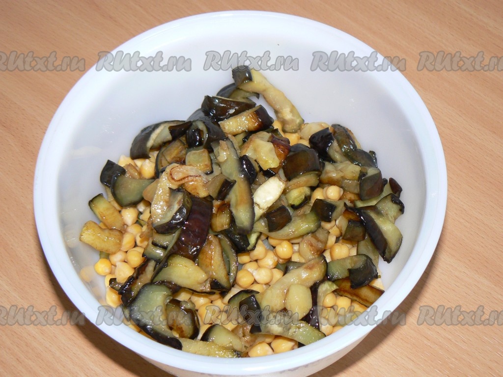 Баклажан порезать, обжарить, добавить к нуту и огурцам.