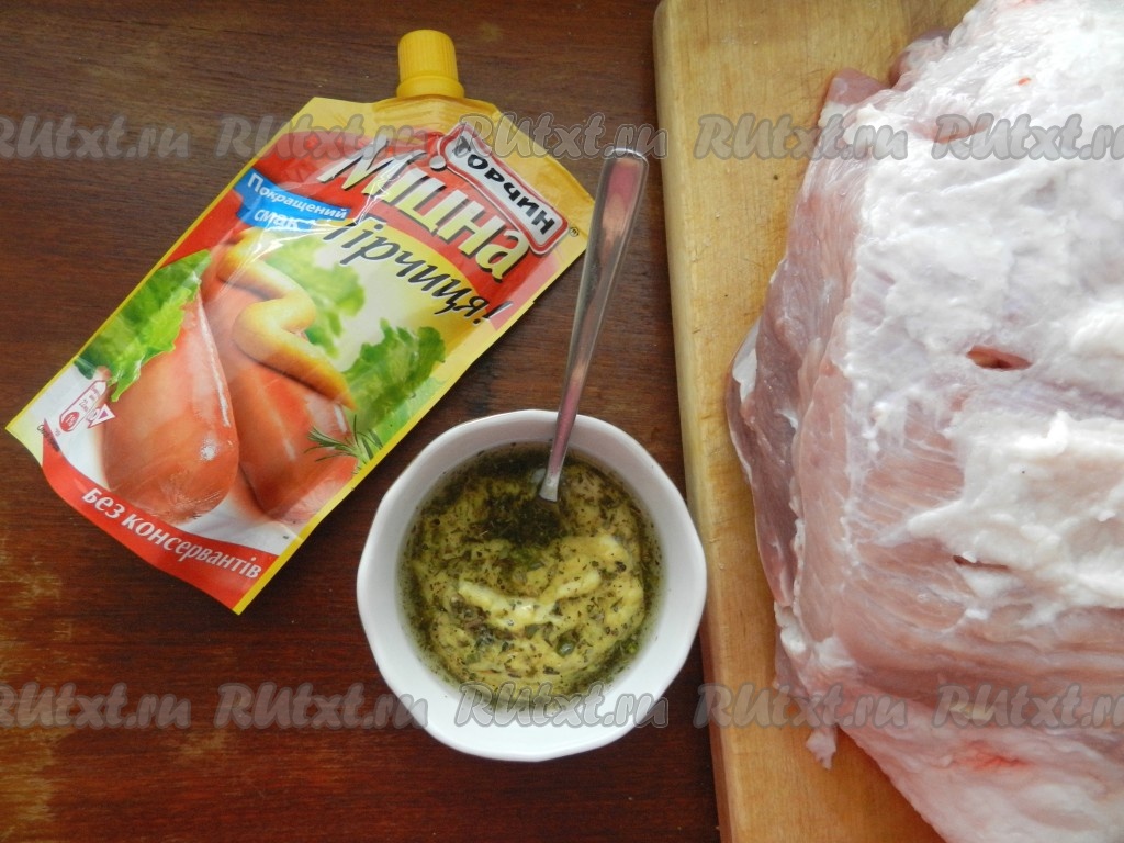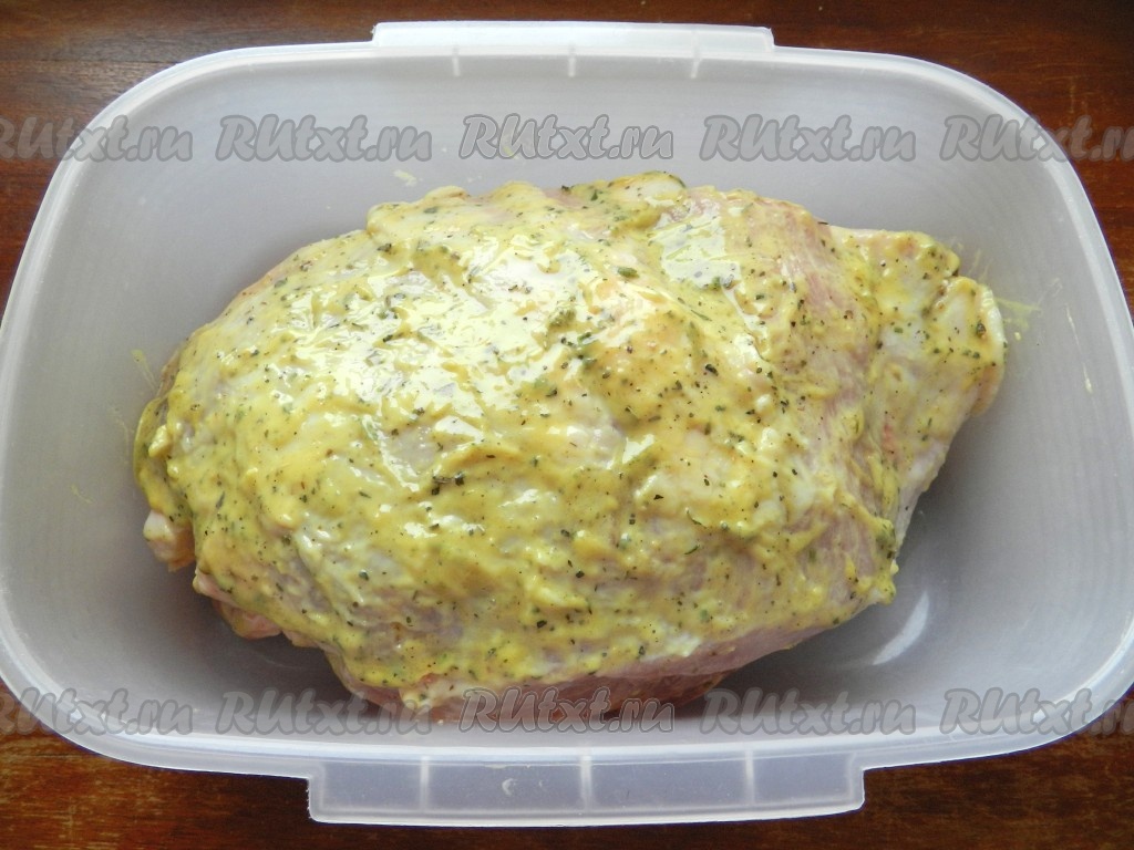 Обмазать свинину со всех сторон смесью горчицы, масла и специй. Оставить в холодильнике на 2-3 часа (можно оставить и на более длительное время, но не более, чем на 24 часа).