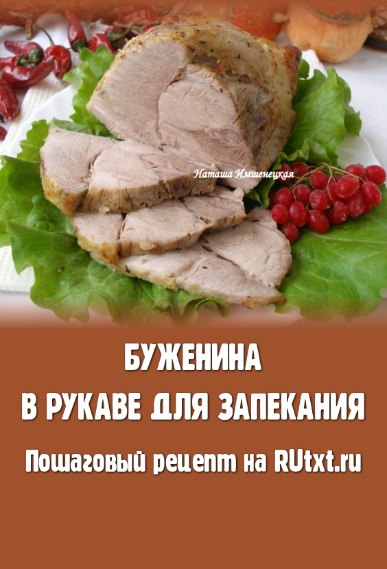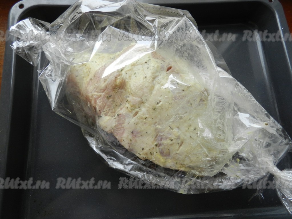 Затем поместить свинину в рукав для запекания, тщательно завязать края рукава с двух сторон, чтобы при запекании не вытекал мясной сок. Запекать буженину в разогретой до 200 градусов духовке 1 час 15 минут. За 10 минут до окончания, можно разрезать рукав, чтобы мясо подрумянилось, в это время полить свинину выделившимся соком.