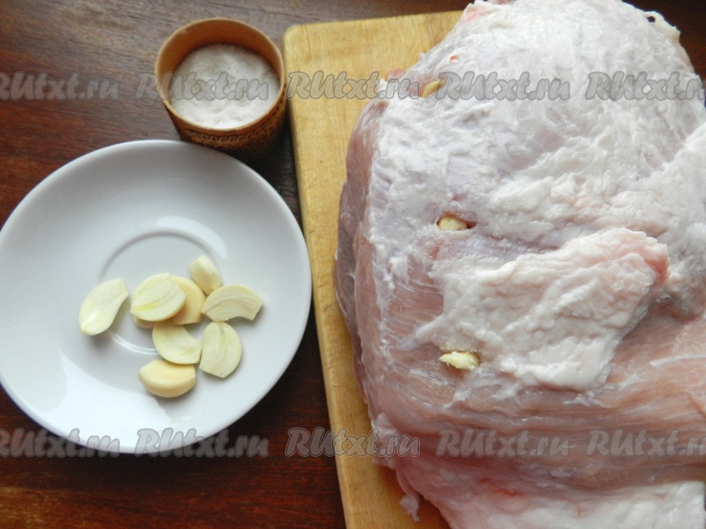 Свинину вымыть, обсушить бумажными полотенцами. Очистить чеснок, если зубчики крупные, разрезать их на части. В мясе сделать небольшие надрезы острым ножом. Дольки чеснока окунуть в соль и вставить в надрезы.