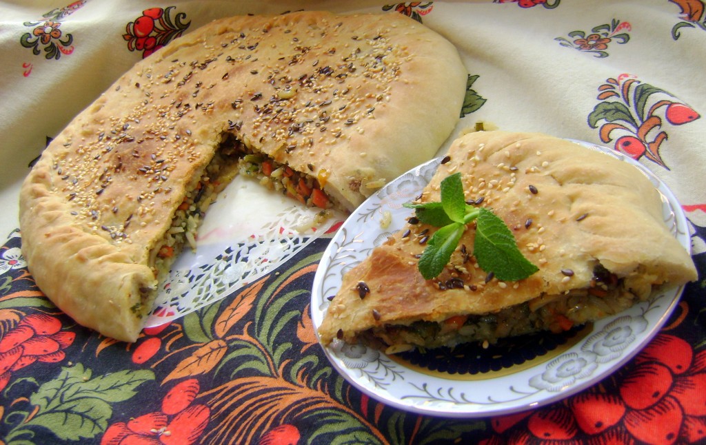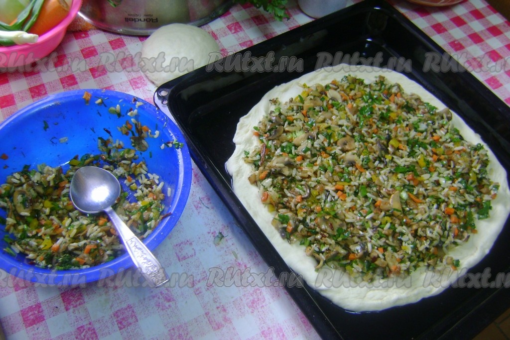 Выпекала постный пирог с грибами, овощами и рисом в разогретой духовке при температуре 180-200 градусов до готовности.