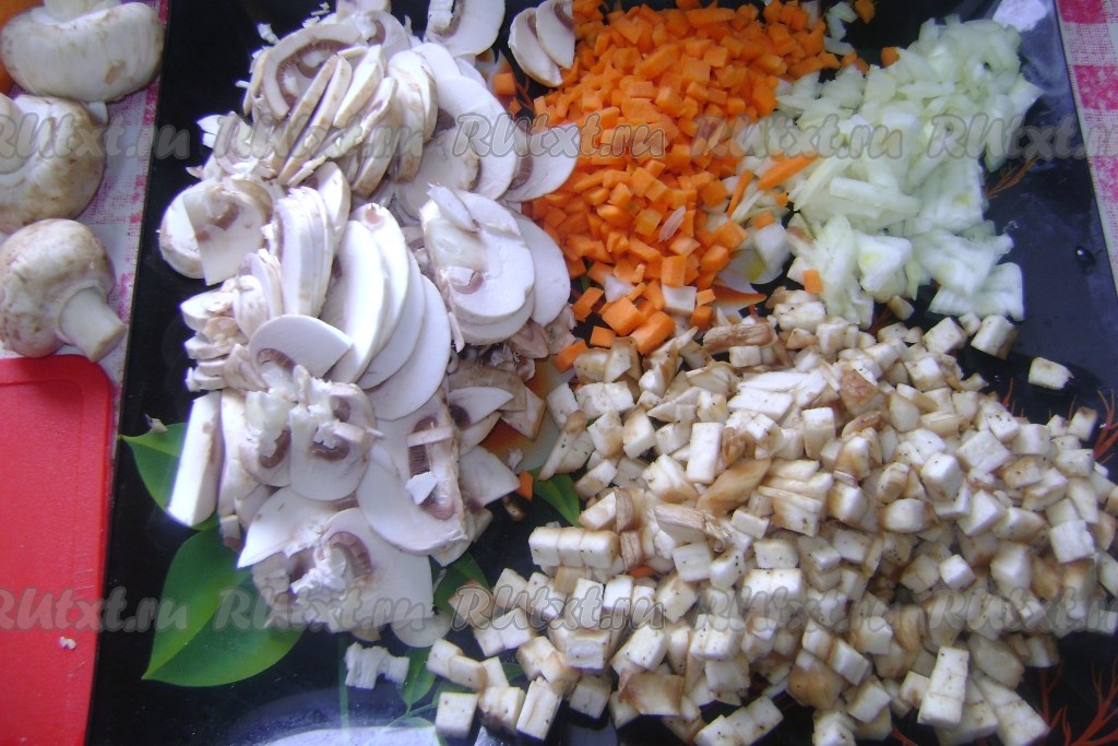 Овощи нарезала мелким кубиком. Шампиньоны тоже измельчила.