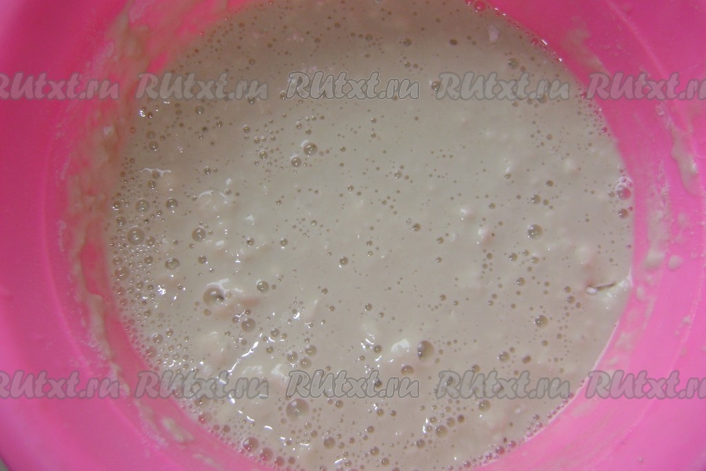 Всыпала муку, перемешала. Оставила опару минут на 20, накрыв пленкой.