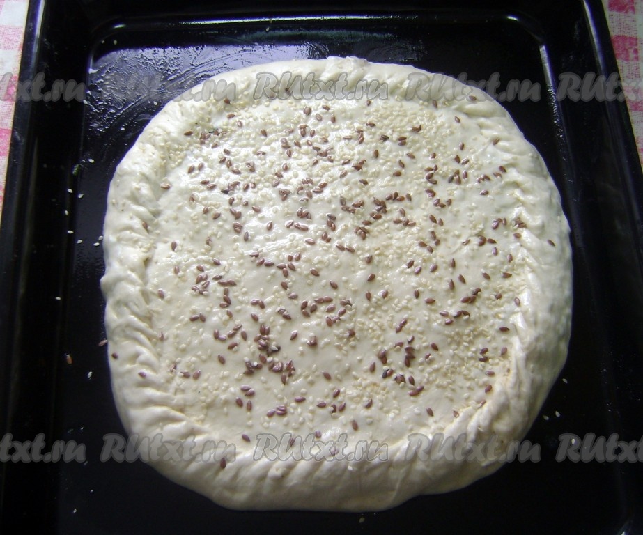 Накрыла другим пластом и защипнула края. Смазала верх пирога маслом, посыпала льняными семенами и кунжутом.