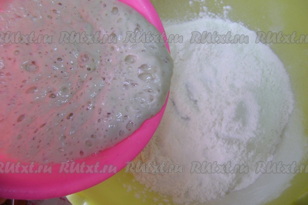 Для приготовления теста в миску просеяла муку, добавила соль, ввела готовую опару и воду.
