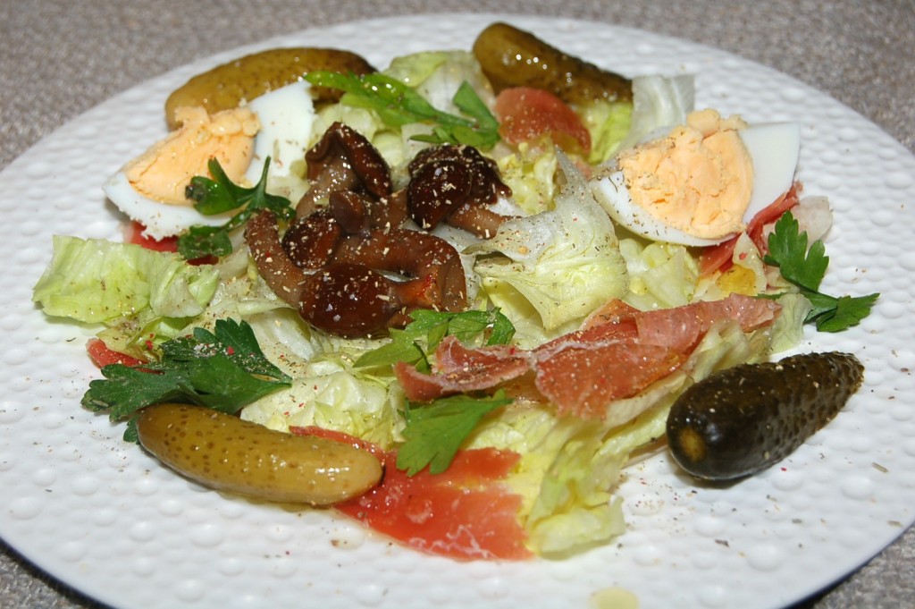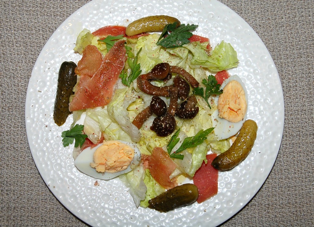 Посыпать сверху солью, перцем, специями, полить оливковым маслом, добавить петрушки и вкуснейший салат с ветчиной и грибами готов.