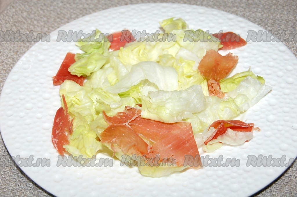 Ветчину нарезать некрупными кусками и разложить на салате.