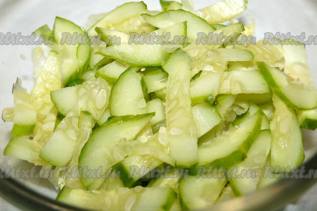 Свежий огурец нарезать небольшими кусочками и добавить в миску.