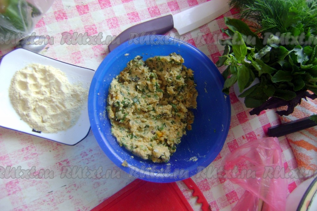 Перемешала хорошенько. Добавила специи (регулируйте по вкусу) и масло, перемешала и добавила муку (примерно 2 столовые ложки (1 столовая ложка кукурузной муки и 1 столовая ложка пшеничной муки)), столько чтобы нутовый фарш лепился в котлетки. Фарш получается мягким, липким и удобным в работе (можете и без муки попробовать).