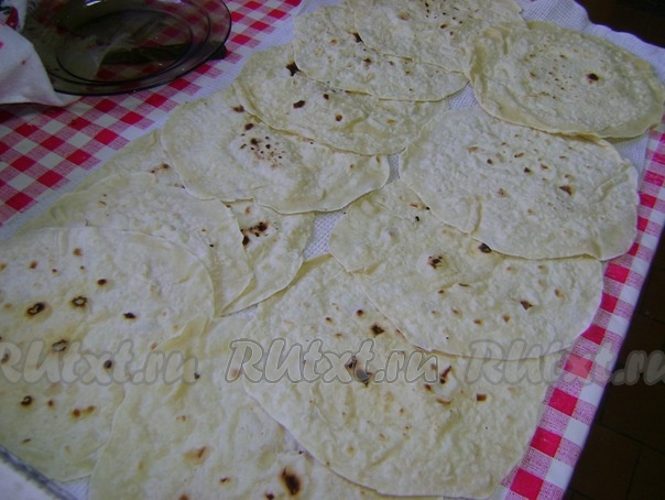 Этот лаваш практически сразу высыхает, его нужно побрызгать водой, а можно и просто быстро под струю воды подставить, но быстро, и выложить на полотенце, дать высохнуть.