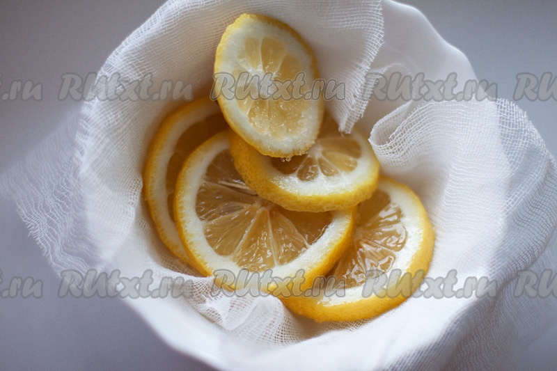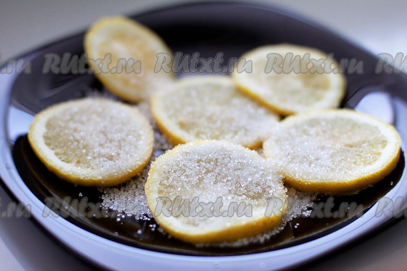 Нарежьте лимон тонкими кружками и уложите в тарелку, засыпав сахаром (можно прижать другой тарелкой). Оставьте на 20 минут.
