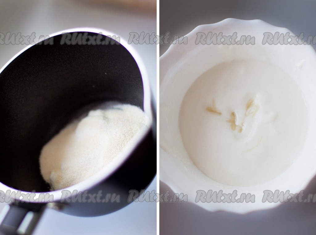 Мороженое положите в миску и дайте ему растаять. Отделите 2 столовые ложки мороженого, уложите в сотейник. Всыпьте в сотейник желатин и оставьте набухать на 20-30 минут. Затем прогрейте на слабом огне до полного растворения желатина и добавьте в растаявшее мороженое. Размешайте и процедите через сито, чтобы избавиться от нежелательных комочков желатина.