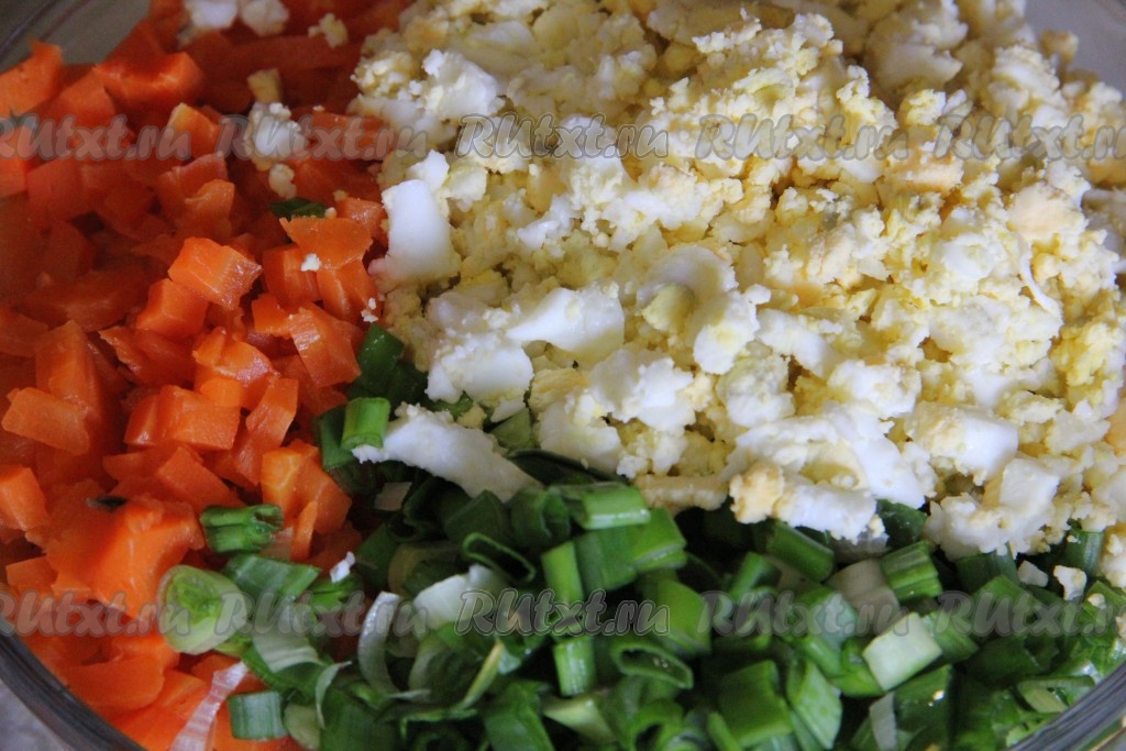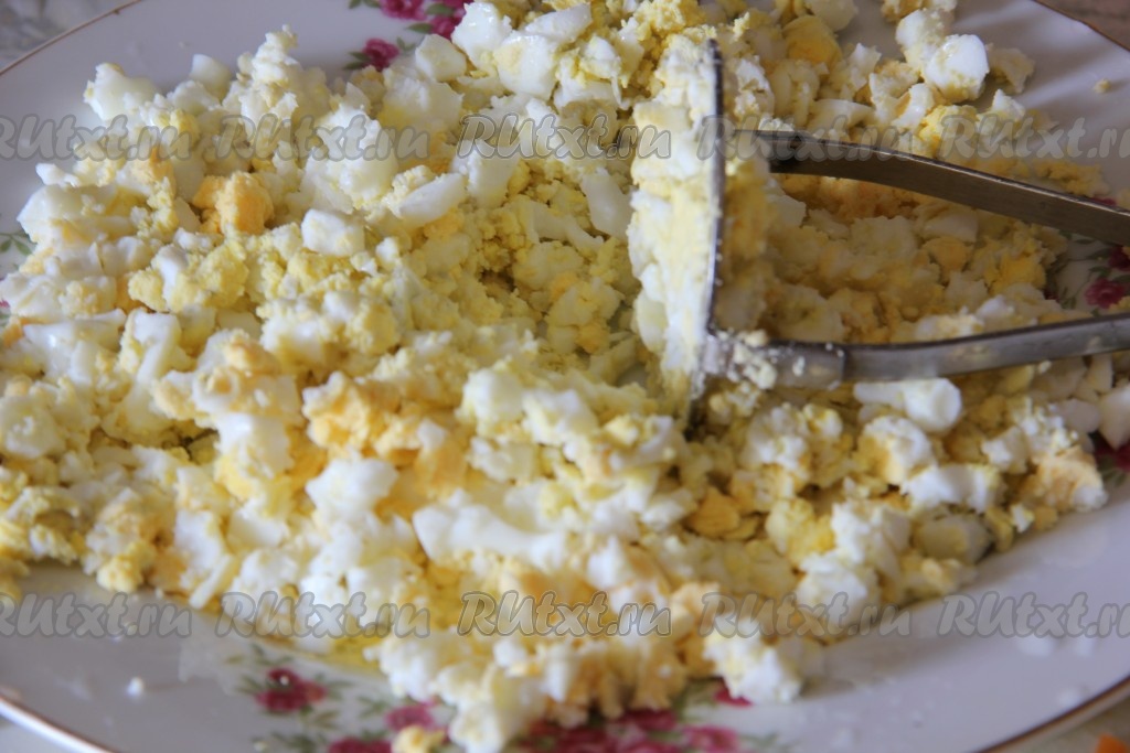 Морковь и яйца отварить до готовности. Яйца измельчить с помощью картофелемялки.