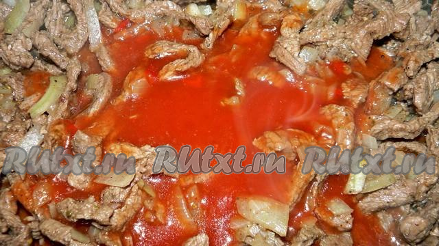 Обжарить говядину на сковороде с добавлением растительного масла на сильном огне, примерно, 3-5 минут. Затем добавить к мясу очищенную и мелко нарезанную луковицу, посолить и обжаривать, периодически помешивая, 5-6 минут (до прозрачности лука). Добавить к мясу томатный соус, перемешать. Если соус густоват, то влейте пол стакана воды. Консистенция соуса должна напоминать сметану средней густоты. Говядина должна быть полностью покрыта соусом. Накрыть сковороду крышкой и тушить мясо на медленном огне минут 30-40.