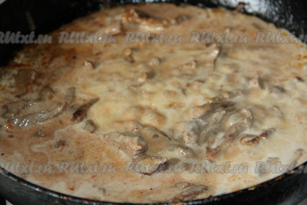 После того как говядина протушится 30-40 минут, влить к ней подготовленный сметанный соус, накрыть сковороду крышкой и тушить бефстроганов 15-20 минут (до мягкости мяса).
