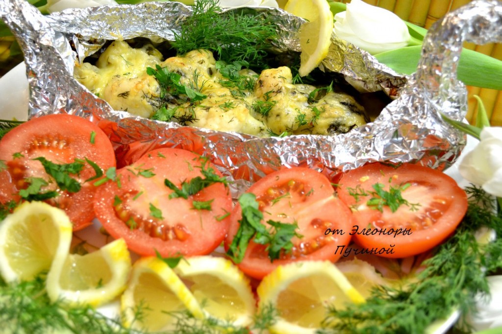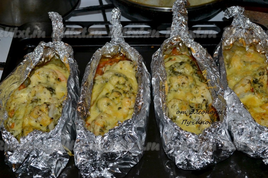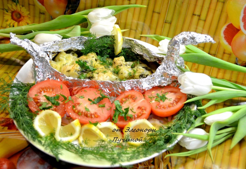 Формируем из фольги лодочки в форме лебедя и ставим рыбу с овощами запекаться в духовку на 15-20 минут при температуре 200-220 градусов.